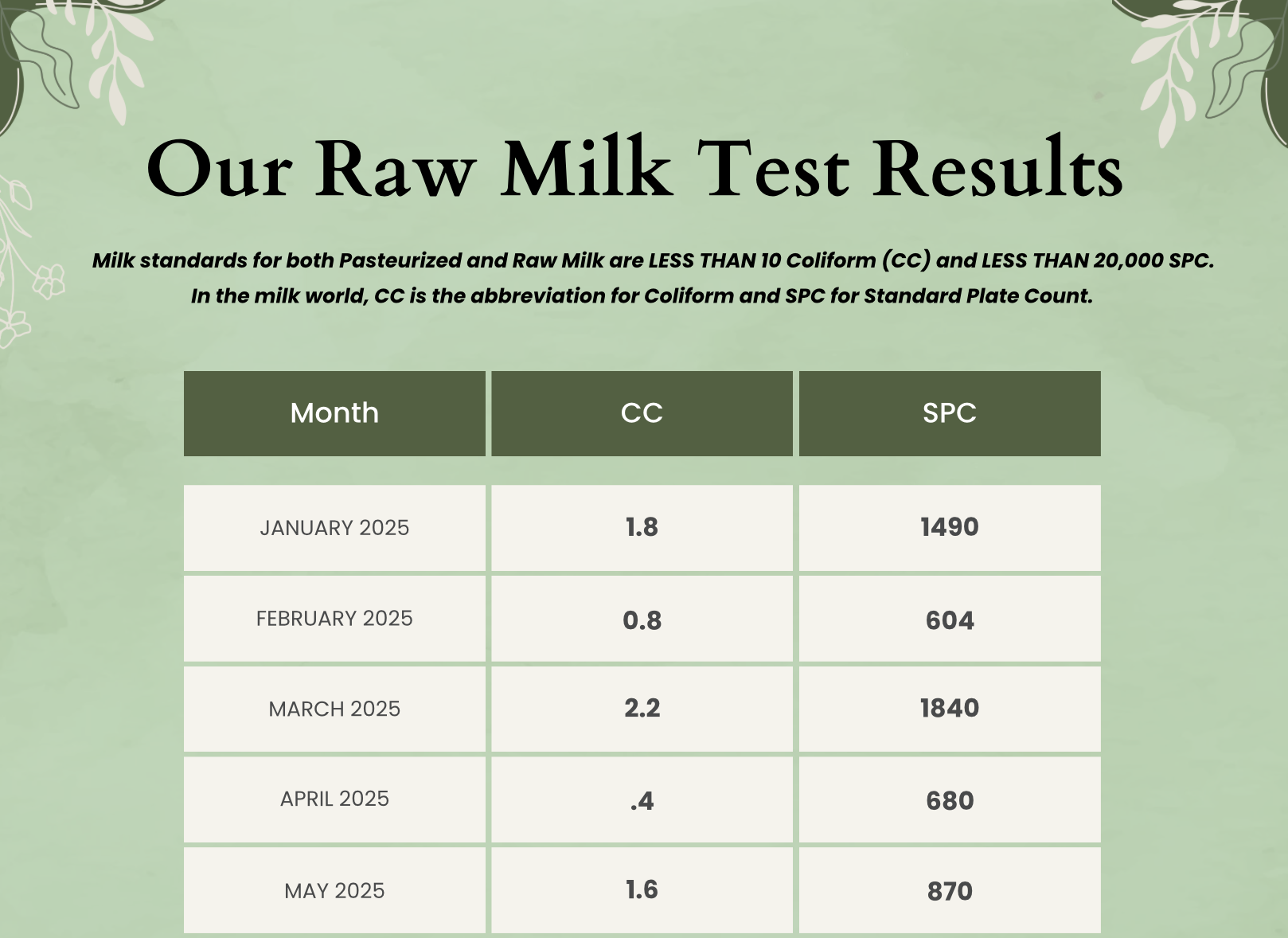 CT Ranch has chosen to voluntarily go beyond requirements for testing of raw milk. For licensed Grade A Raw Milk dairies, Texas Department of Agriculture requires milk testing only once per quarter.